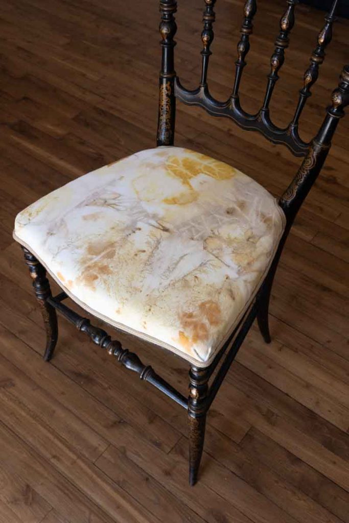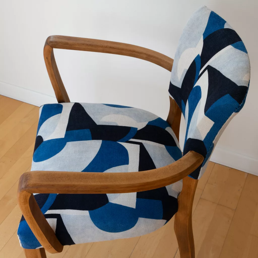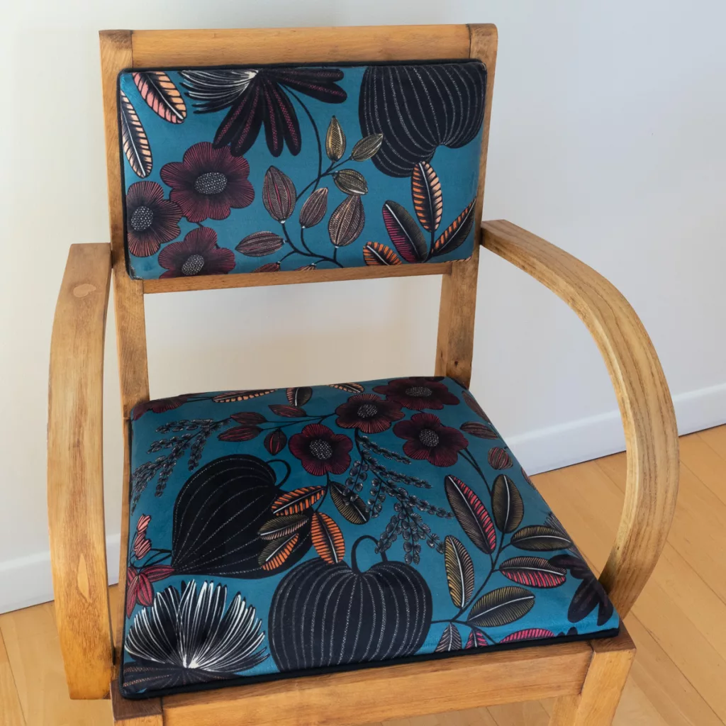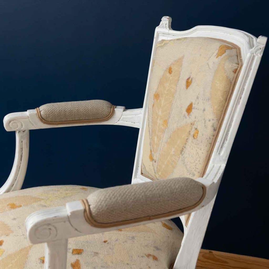 De temps en temps, je chine des sièges anciens que je restaure entièrement avec mes tissus en impression végétale ou des tissus d’éditeurs soigneusement sélectionnés.