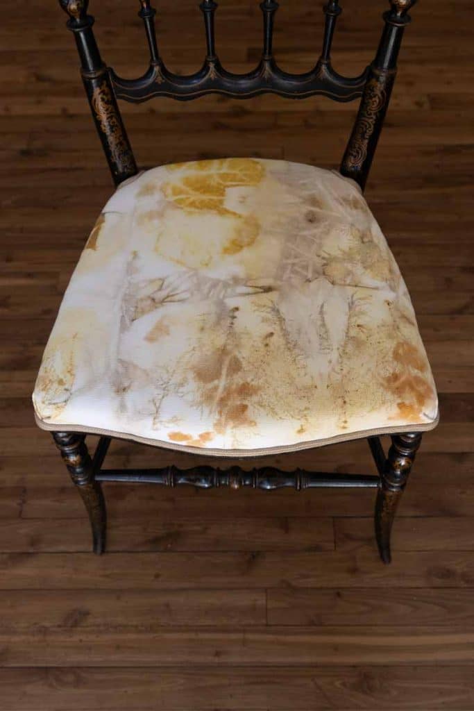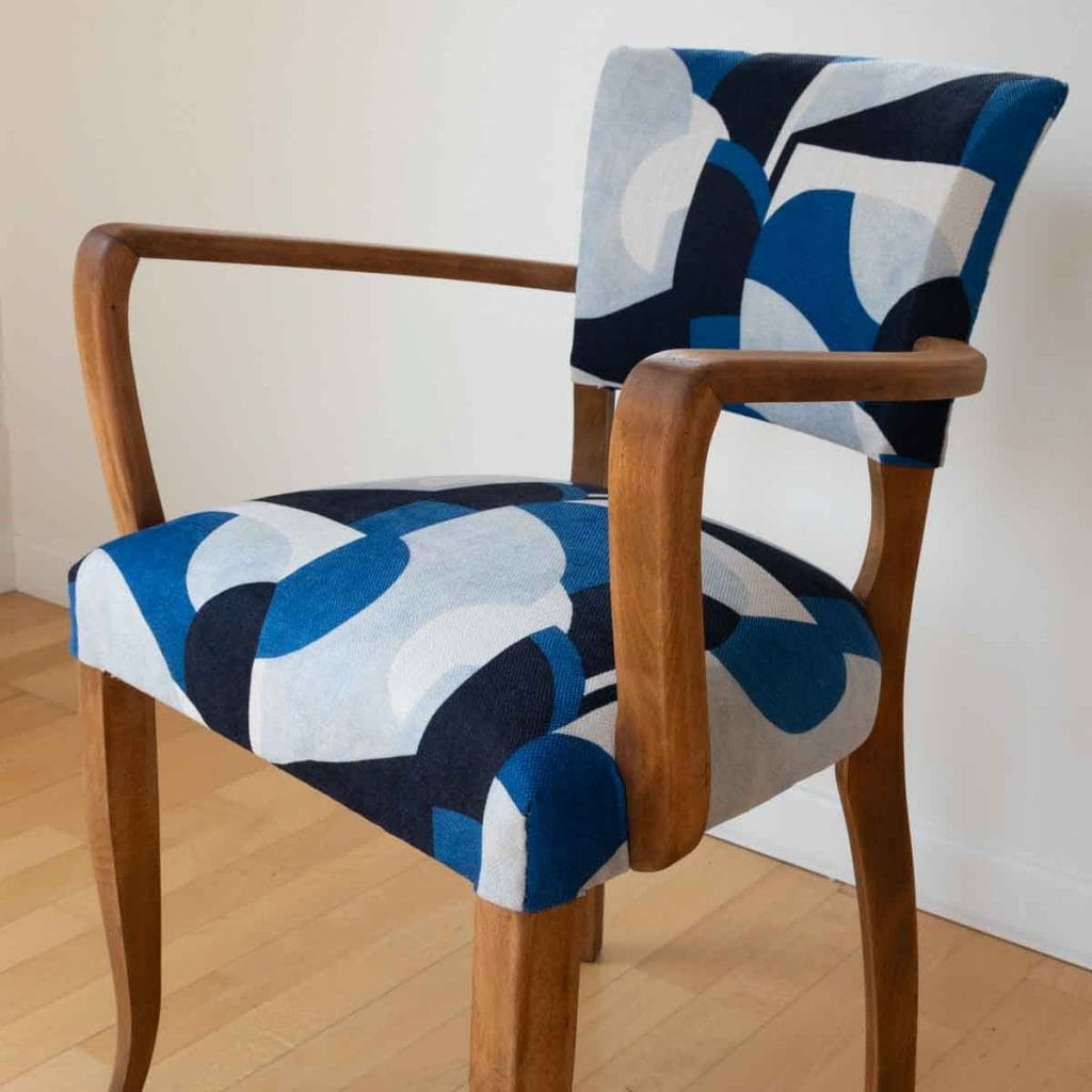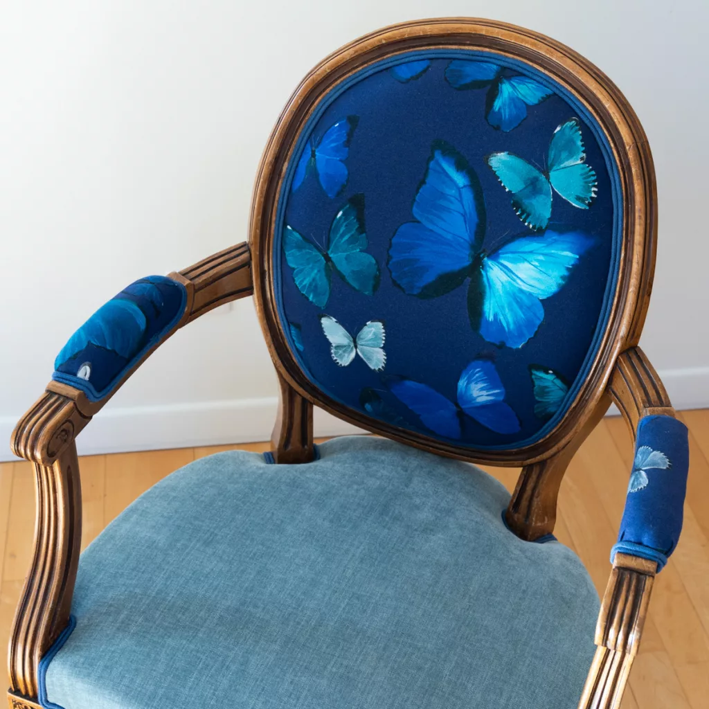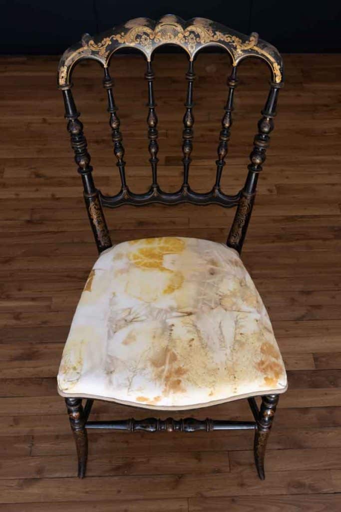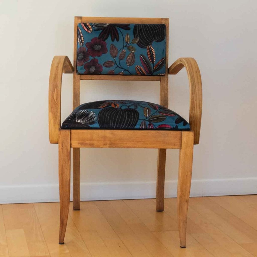 De temps en temps, je chine des sièges anciens que je restaure entièrement avec mes tissus en impression végétale ou des tissus d’éditeurs soigneusement sélectionnés.