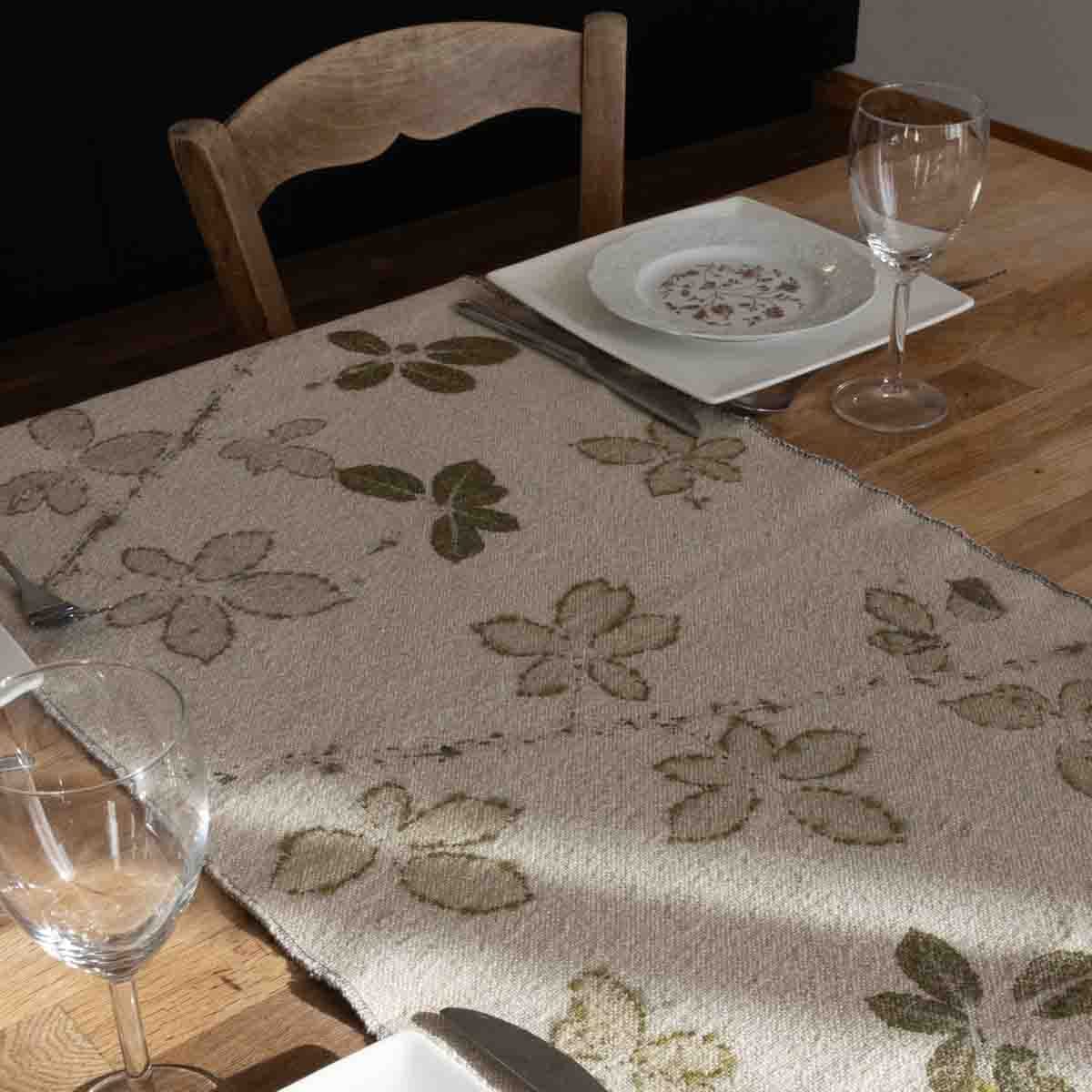 Chaque pièce est le fruit d’un travail artisanal long et minutieux : récolte de plantes locales, mordançage de tissus naturels (lin, chanvre, soie), composition botanique et cuisson lente pour révéler les empreintes végétales.