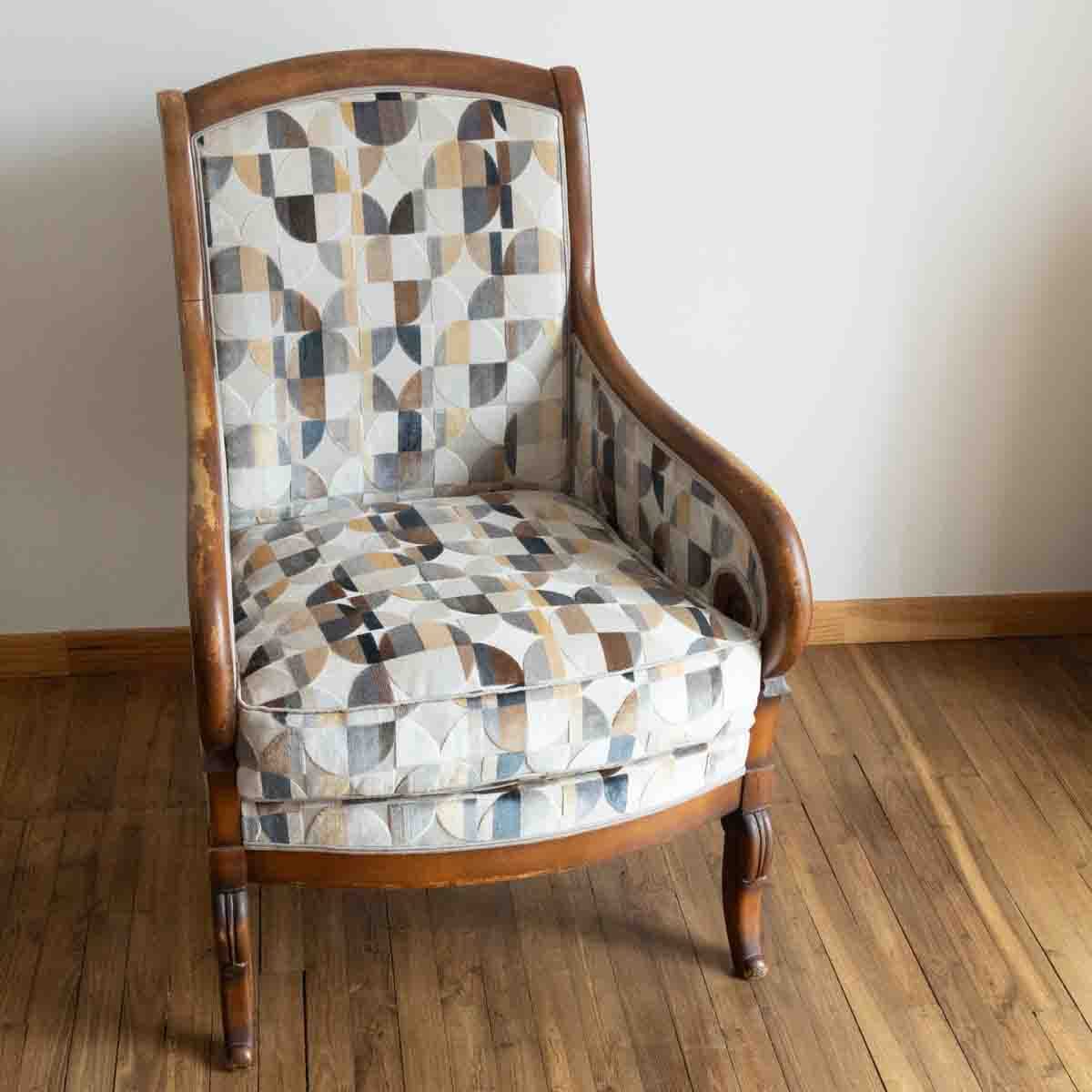 "Tissu velours à motifs géométriques. Intégralement retapissé"