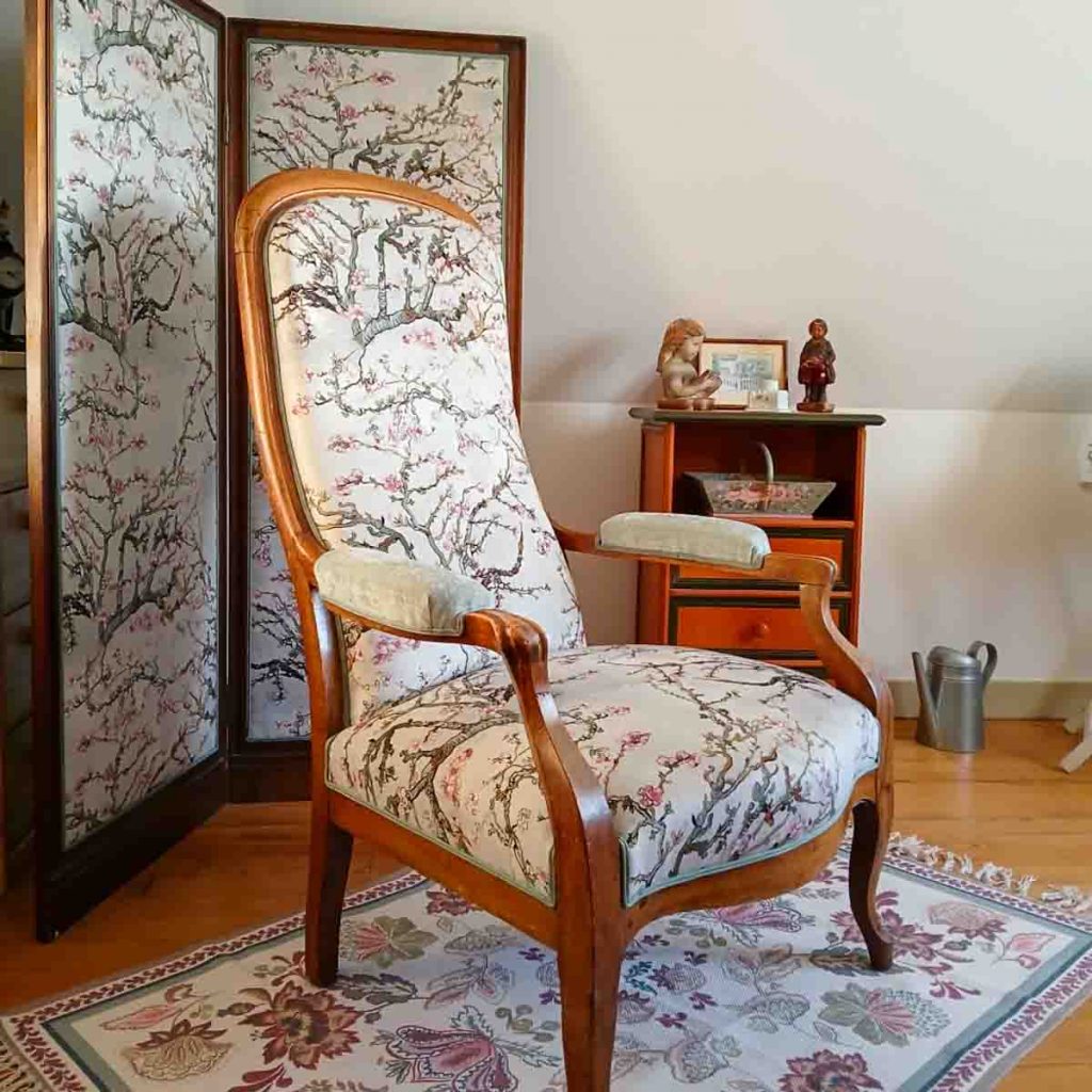 Mes clients ont choisi un tissu délicatement orné de fleurs de cerisier… un clin d’œil poétique à son histoire, puisque ce fauteuil a autrefois vécu au Japon.